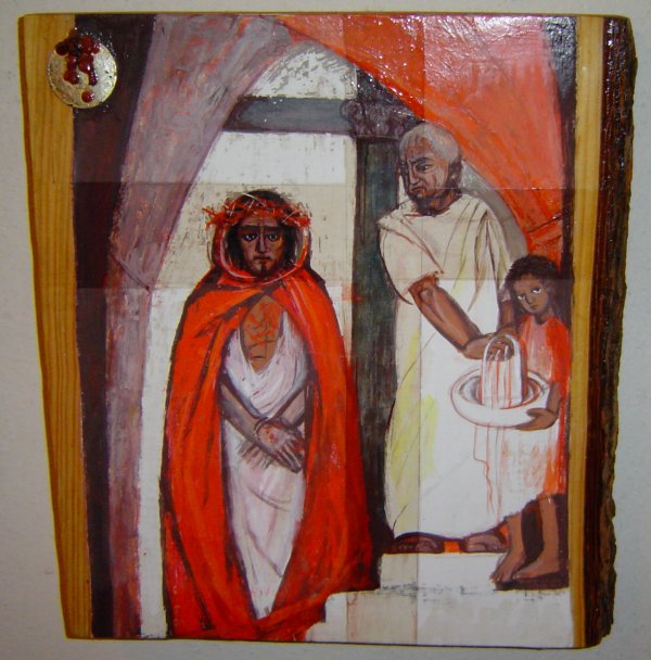 Pilate washes his hands of the guilt of Christ’s execution. In the corner is one of the thirty pieces of silver, the blood-money given to Judas for betraying Jesus.