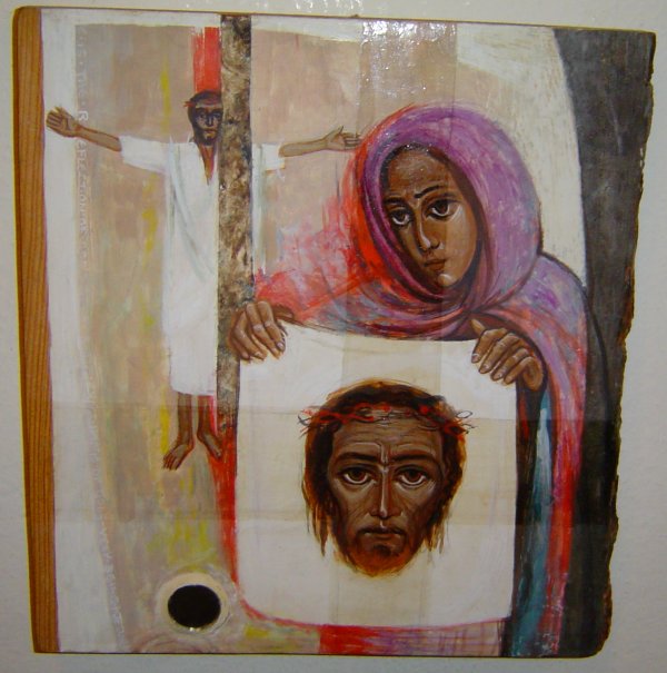 ‘Veronica’ means ‘true likeness’. In the legend a woman who pities Jesus wipes the blood and sweat from his face with her veil,
